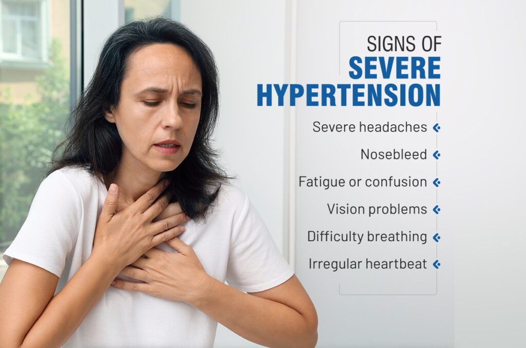 WHAT ARE THE SYMPTOMS AND SIGNS OF HIGH BLOOD PRESSURE (HYPERTENSION)? Headaches: Severe headaches, especially in the back of the head, can sometimes occur. Breathing difficulty: Difficulty with breathing, including shortness of breath, can arise, especially during physical activity or exertion. Nosebleeds: Frequent or severe nosebleeds can be a sign of high blood pressure in some